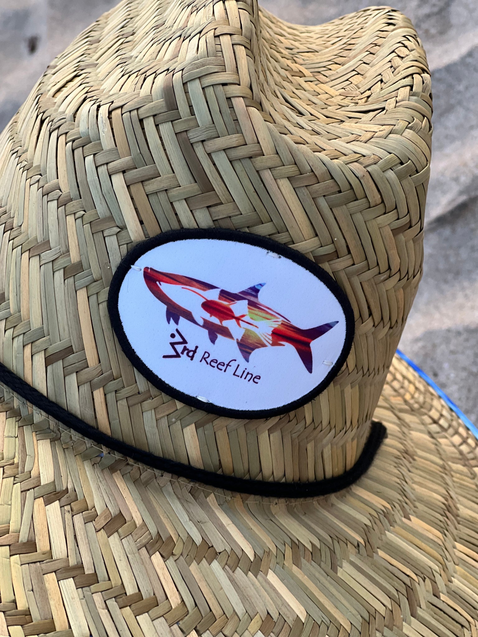 Materials: Straw hat with polyester sublimated under-brim, drawstring, and sewed patch